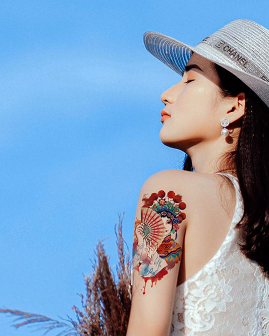 Our tattoo stickers are Juice Tattoo Stickers. The principle is that they extract genipin from Gardenia fruit, which reacts with the amino acids in the skin's surface layer to produce color. These tattoos last about two weeks, although they fade a bit faster, roughly within a week, on the backs of hands and fingers as they naturally peel off due to skin renewal. They are sweat-proof and waterproof, and once they've fully developed their color, they don't reflect light, creating a realistic and natural appearance.