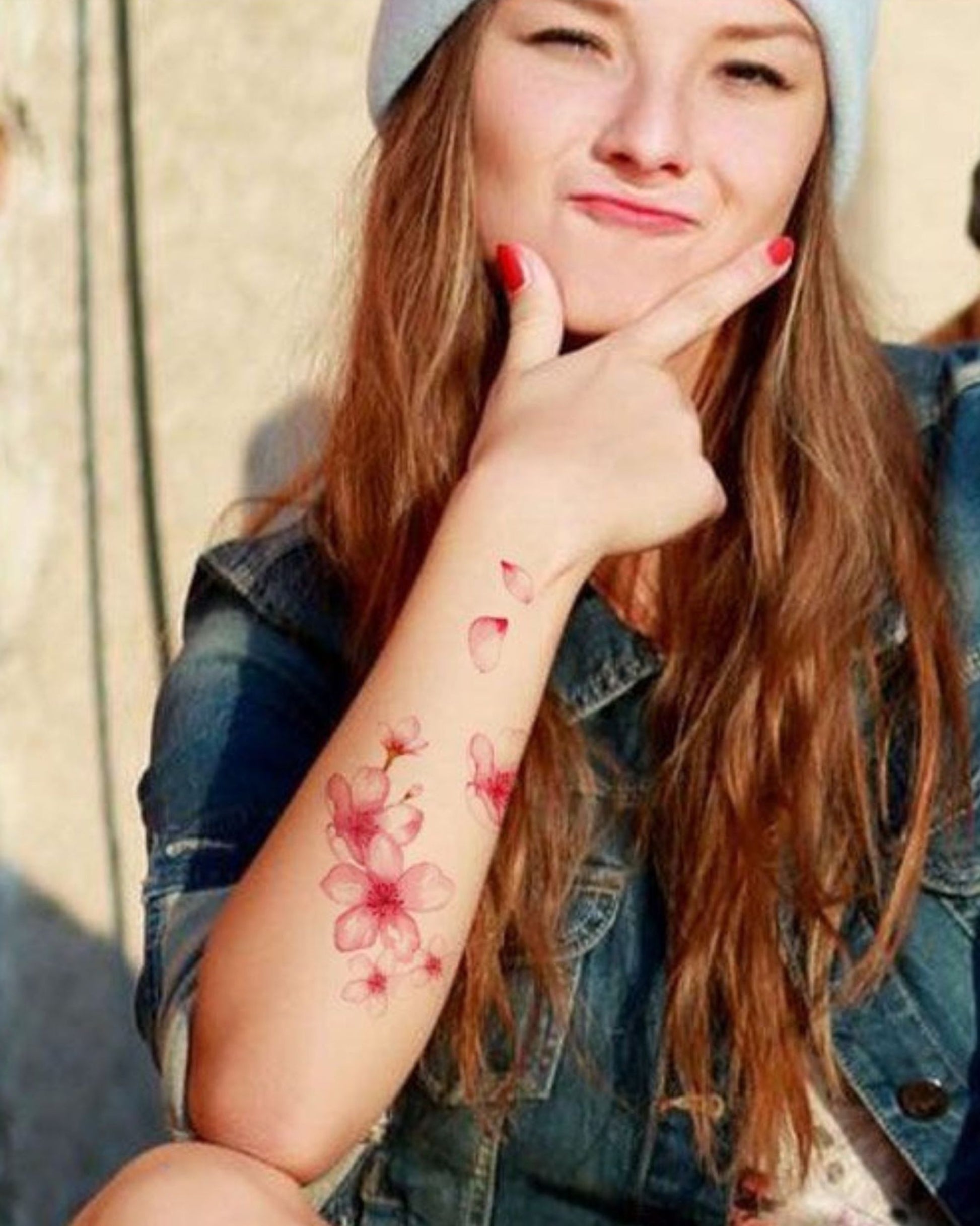 Step into a world of ethereal charm with the enchanting pink cherry blossom tattoo.