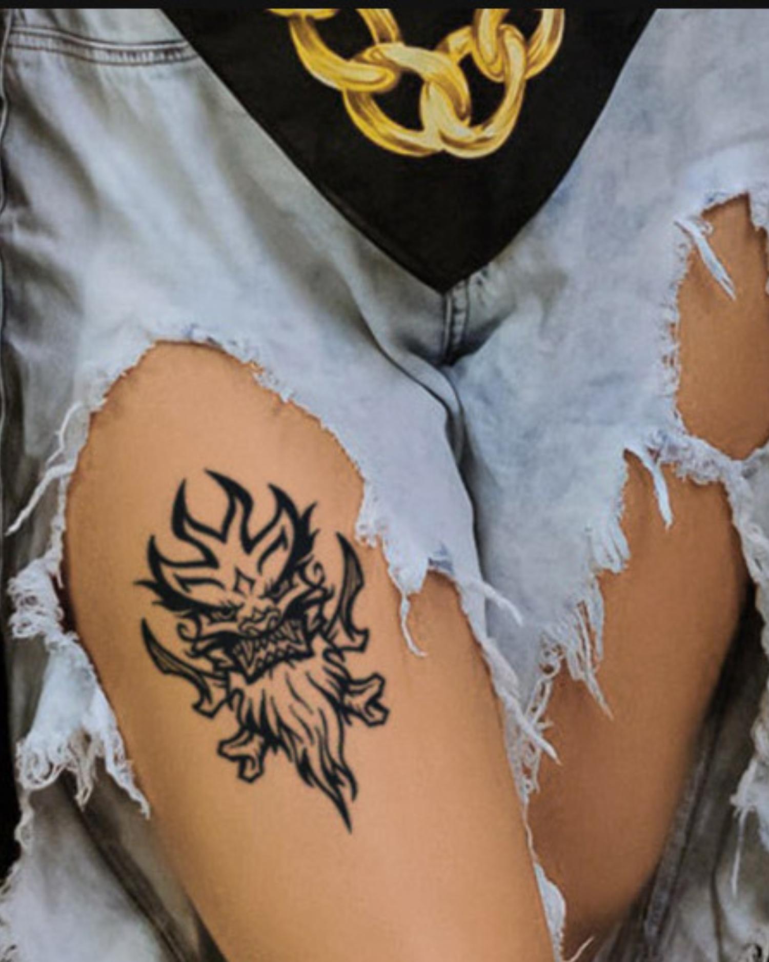The confidential herbal tattoo sticker, primarily made from the rubiaceae plant gardenia, reacts organically with skin keratoprotein, turning the skin blue and then bluish-black as the color intensifies. The color is retained on the skin's stratum corneum, part of the epidermis, which also includes the basal membrane and basal lamina. As aged keratinocytes are shed in a typical 2-4 week metabolic cycle, the tattoo color fades without leaving residues or causing side effects.