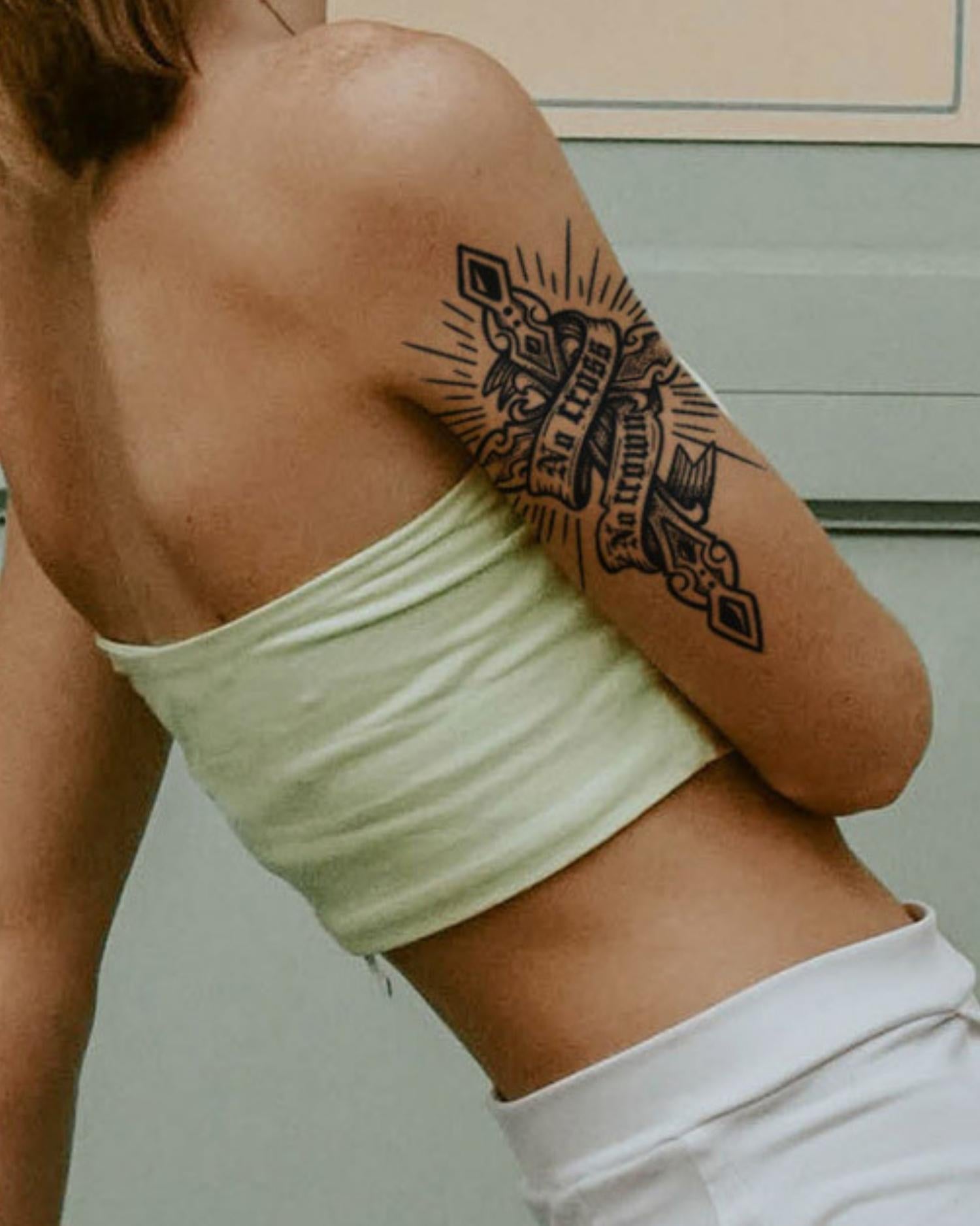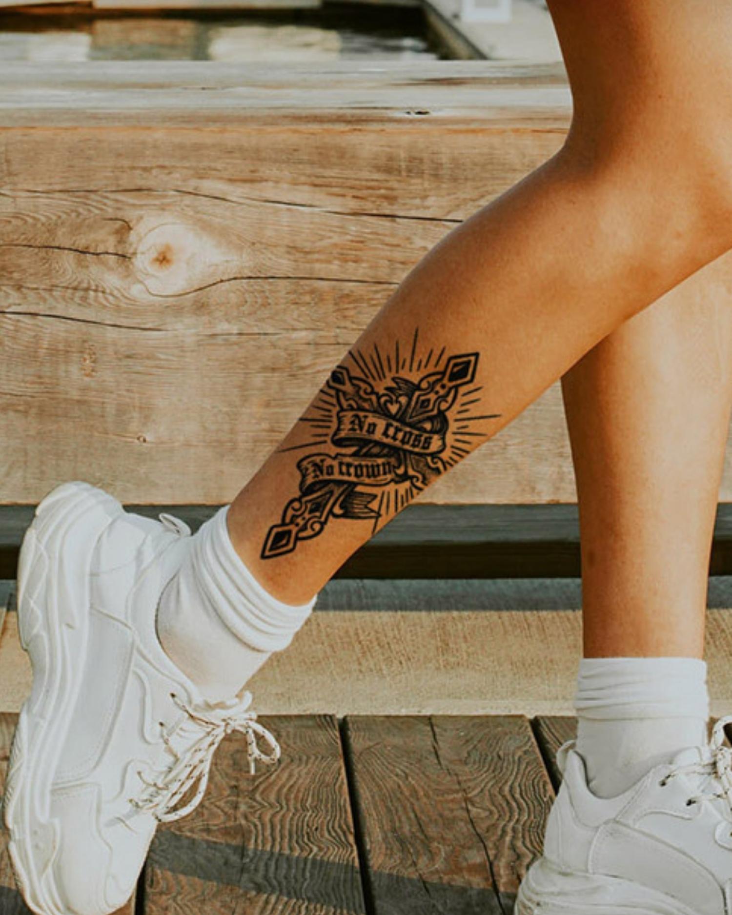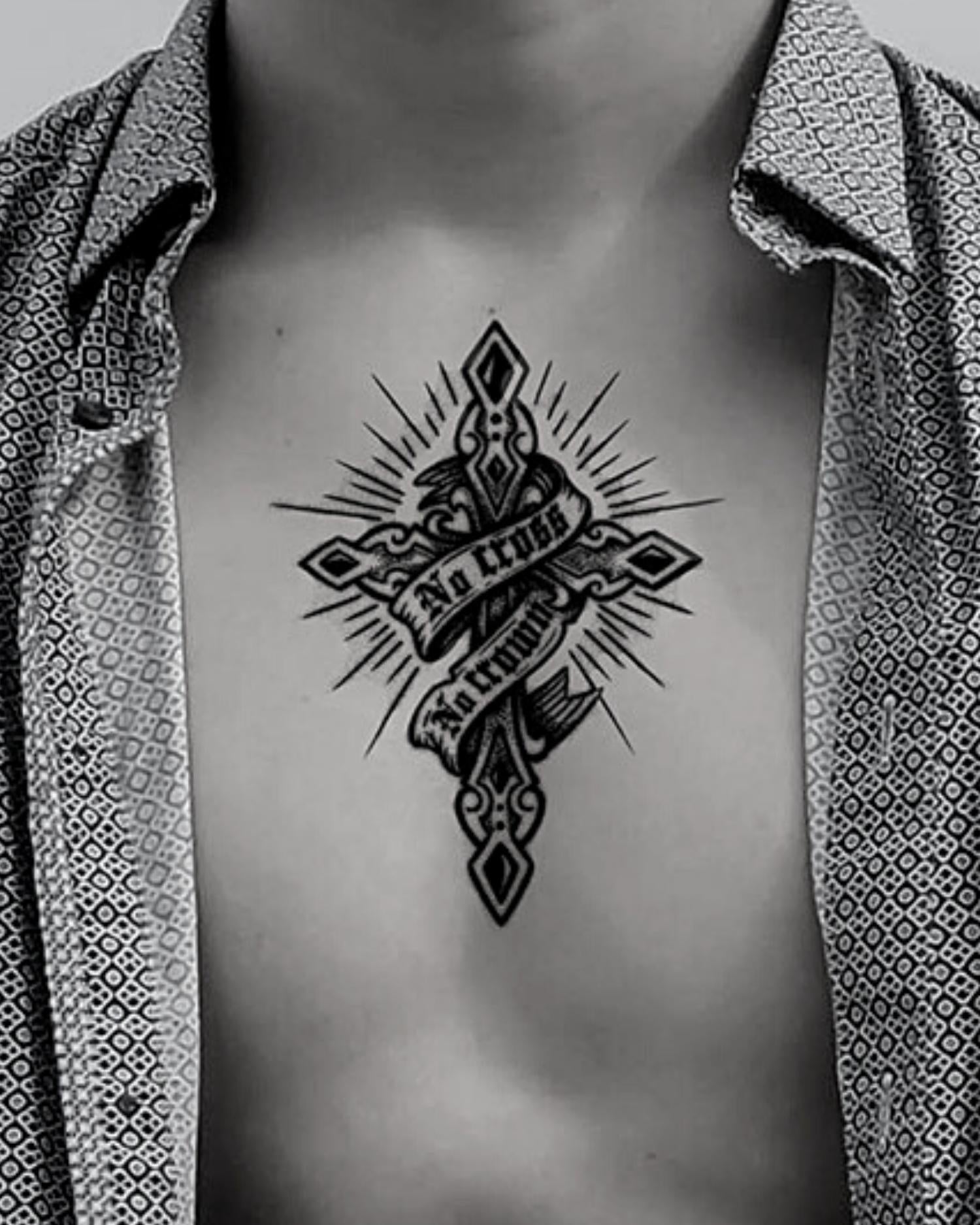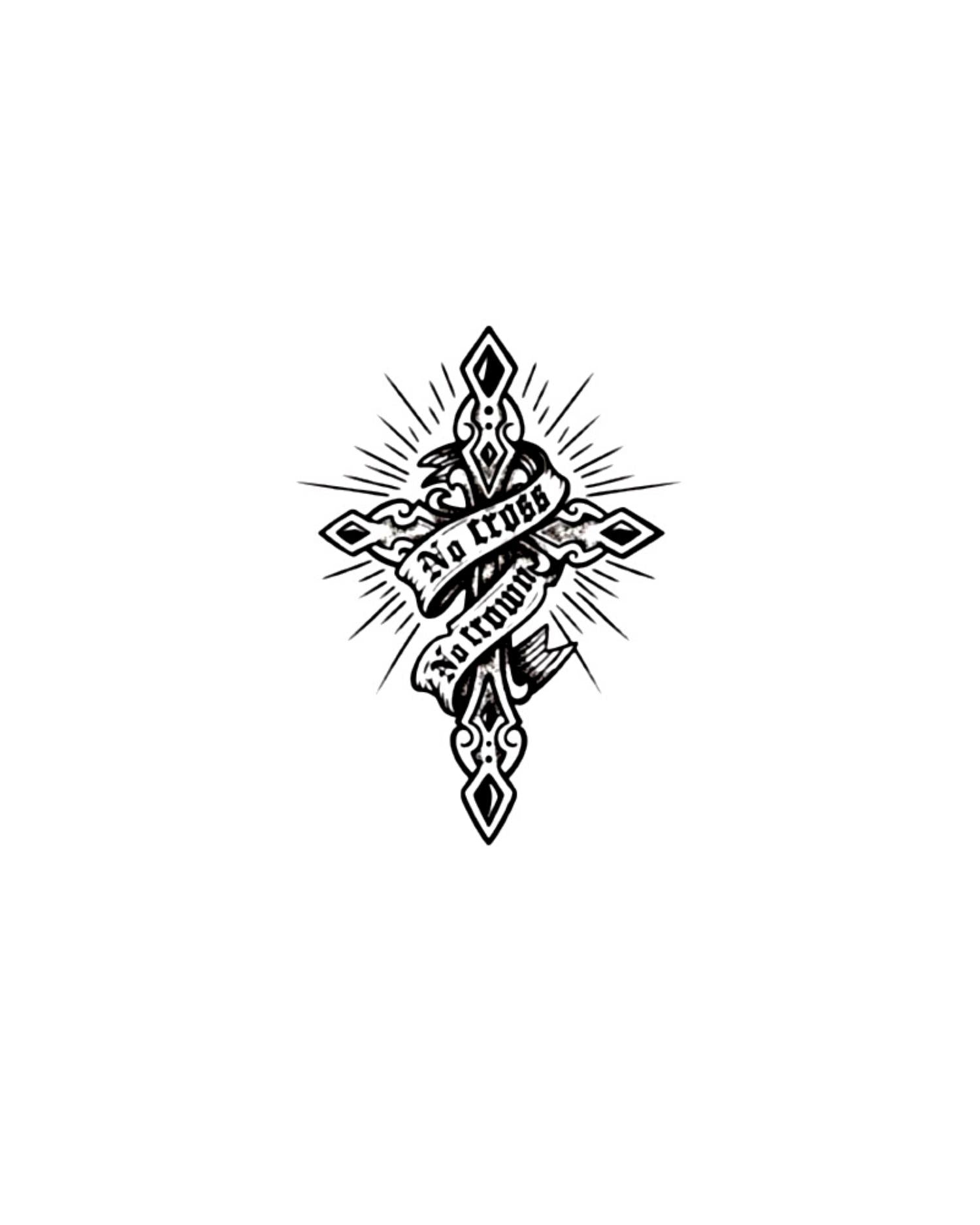 The 'Journey of Honor' cross tattoo embodies a powerful symbol of courage, sacrifice, and spiritual fortitude within American tattoo culture.