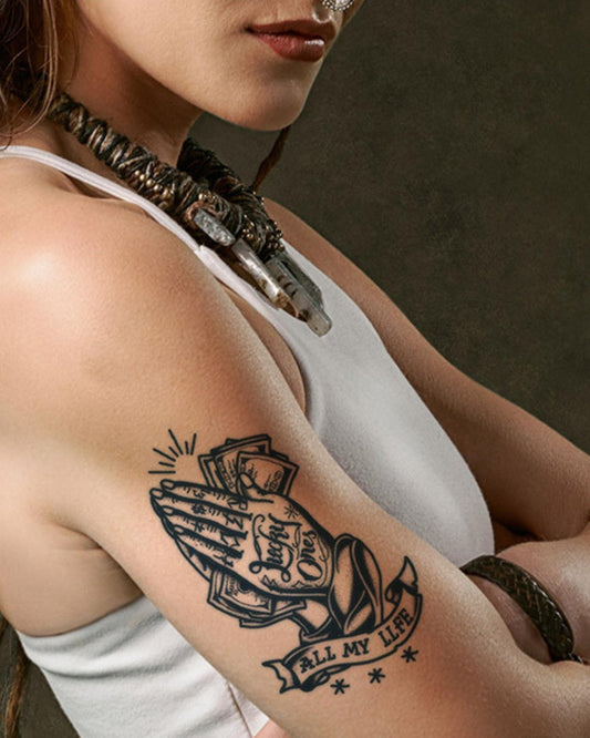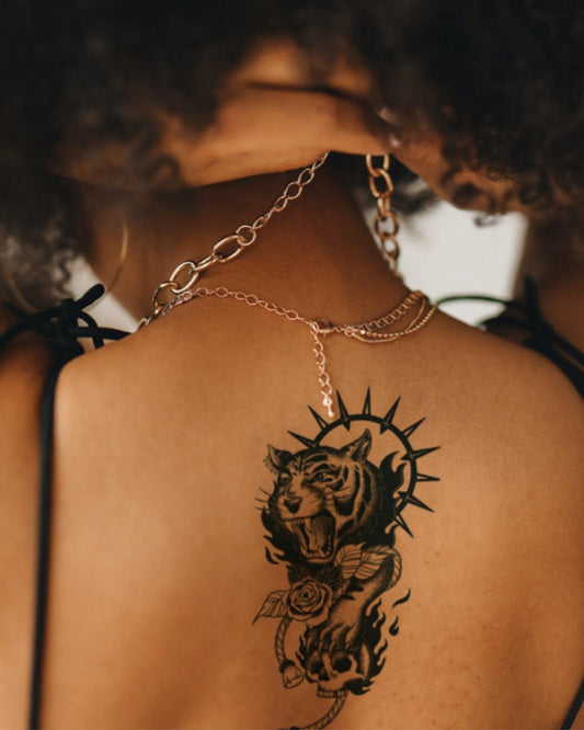 Nuestras pegatinas de tatuaje son pegatinas de tatuaje de jugo. El principio es que extraen genipina de la fruta Gardenia, que reacciona con los aminoácidos en la capa superficial de la piel para producir color. Estos tatuajes duran alrededor de dos semanas, aunque se desvanecen un poco más rápido, aproximadamente en una semana, en el dorso de las manos y los dedos, ya que se desprenden naturalmente debido a la renovación de la piel. Son a prueba de sudor e impermeables, y una vez que han desarrollado completamente su color, no reflejan la luz, creando una apariencia realista y natural.