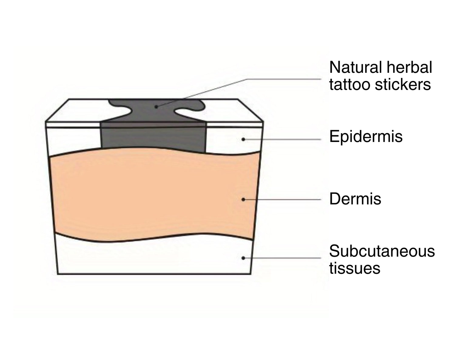 The confidential herbal tattoo sticker, primarily made from the rubiaceae plant gardenia, reacts organically with skin keratoprotein, turning the skin blue and then bluish-black as the color intensifies. The color is retained on the skin's stratum corneum, part of the epidermis, which also includes the basal membrane and basal lamina. As aged keratinocytes are shed in a typical 2-4 week metabolic cycle, the tattoo color fades without leaving residues or causing side effects.