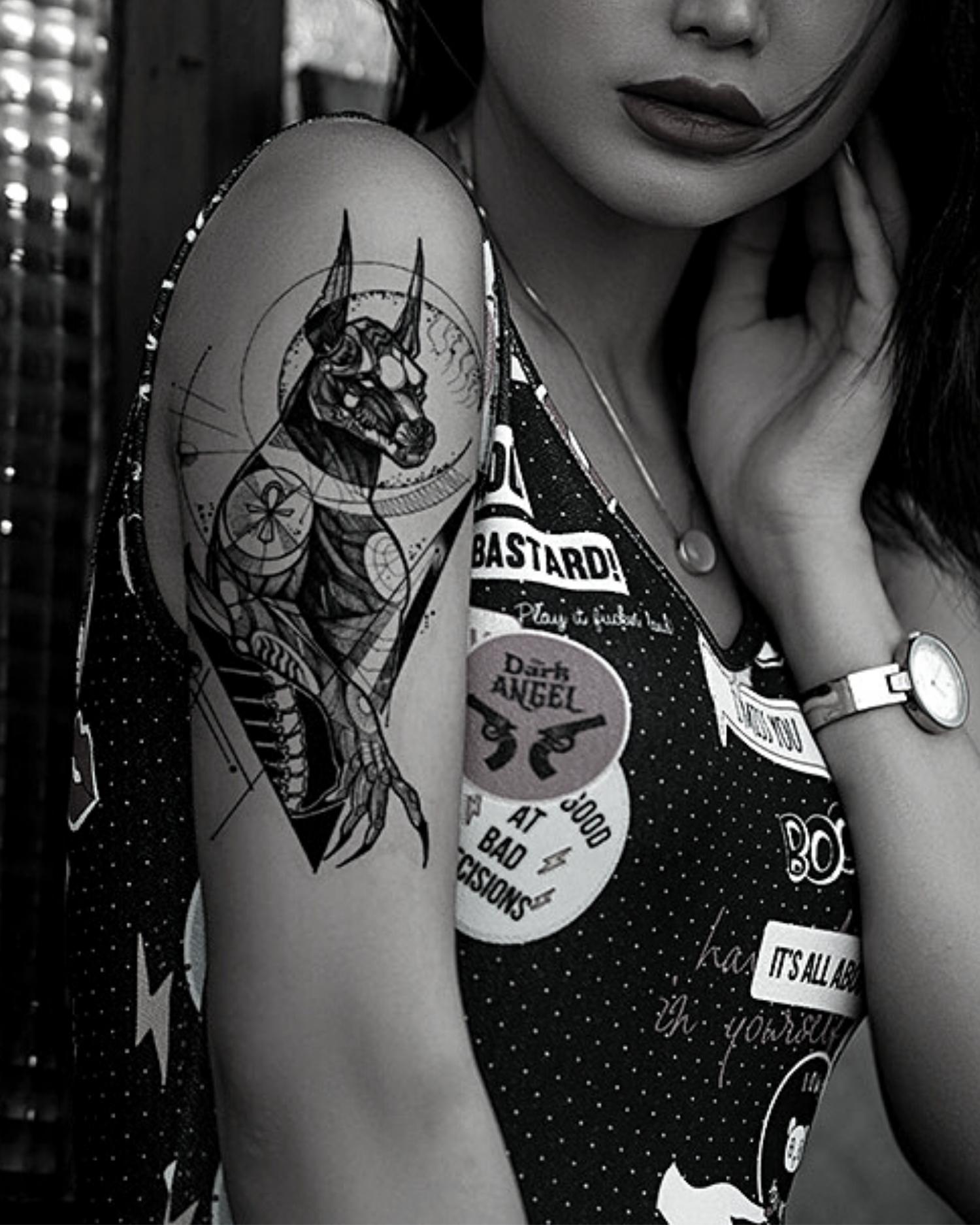 Anubis is a stylish, modern tattoo featuring the ancient Egyptian god. It is a great way to honor heritage and add a unique flair to your style. Anubis has an eye-catching design that is sure to turn heads and add an element of mystery.